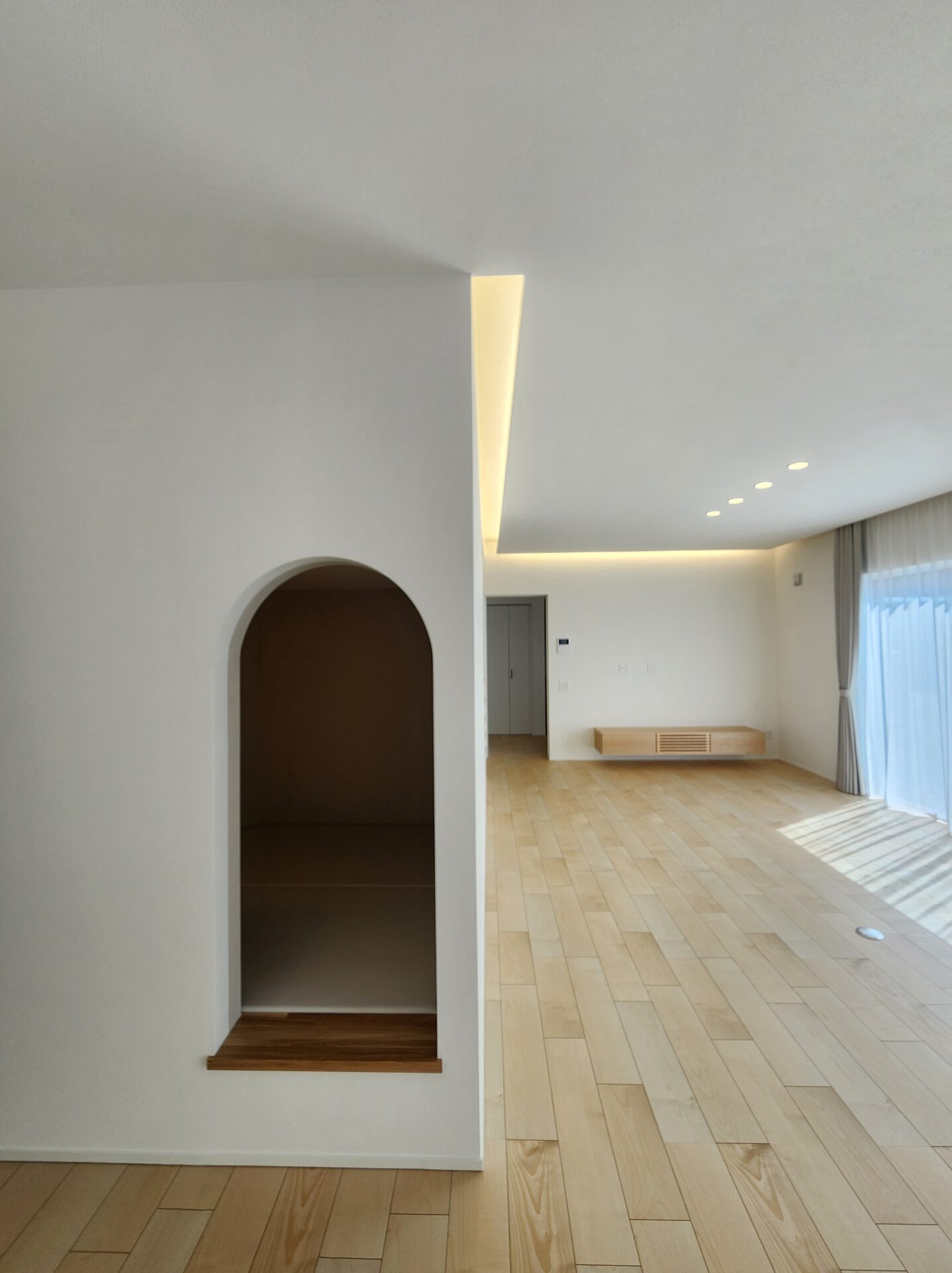 光源を直接見せない間接照明ならではのやわらかな光が空間全体を包み込み、昼と夜で異なる表情を楽しめます。