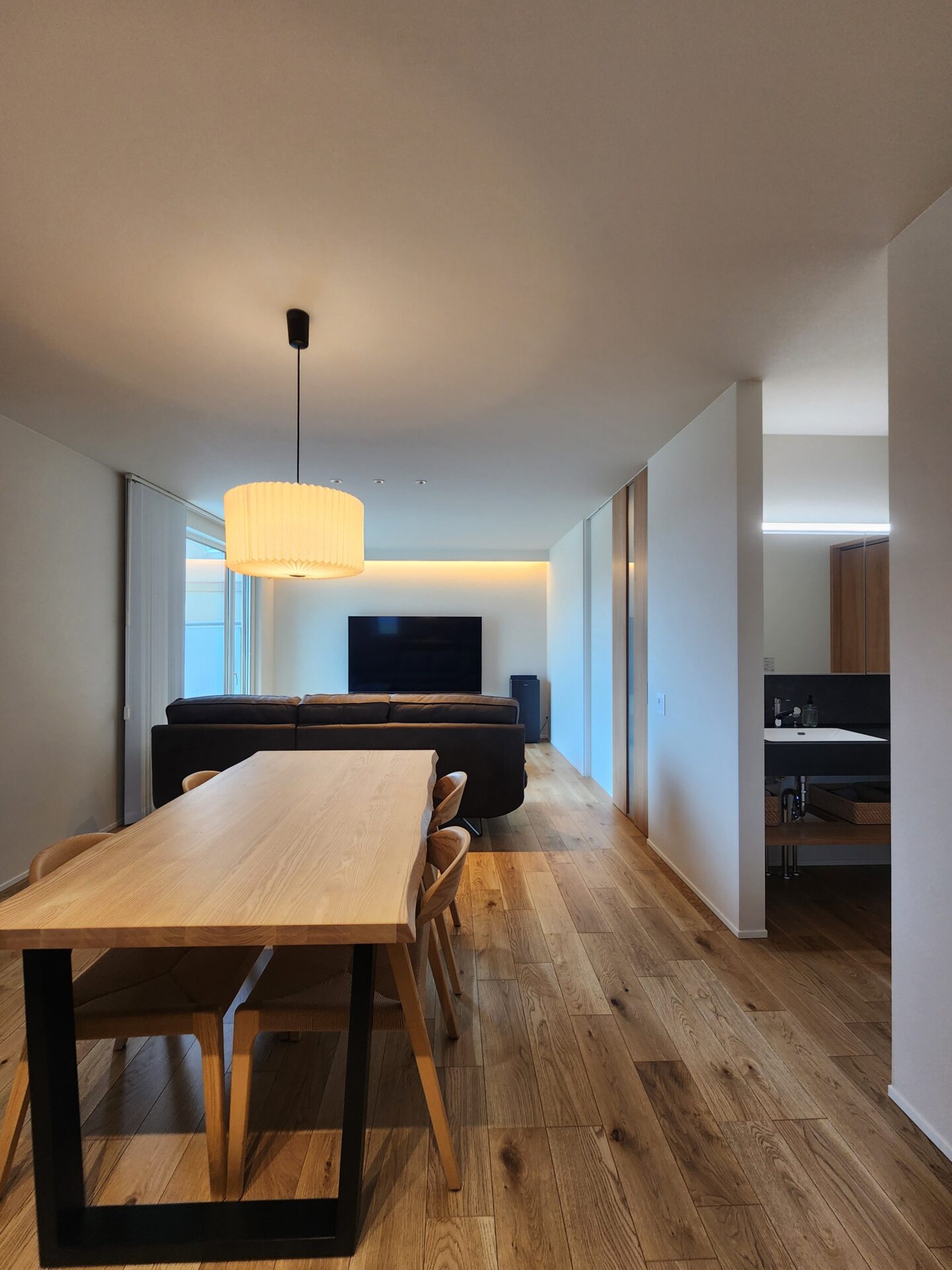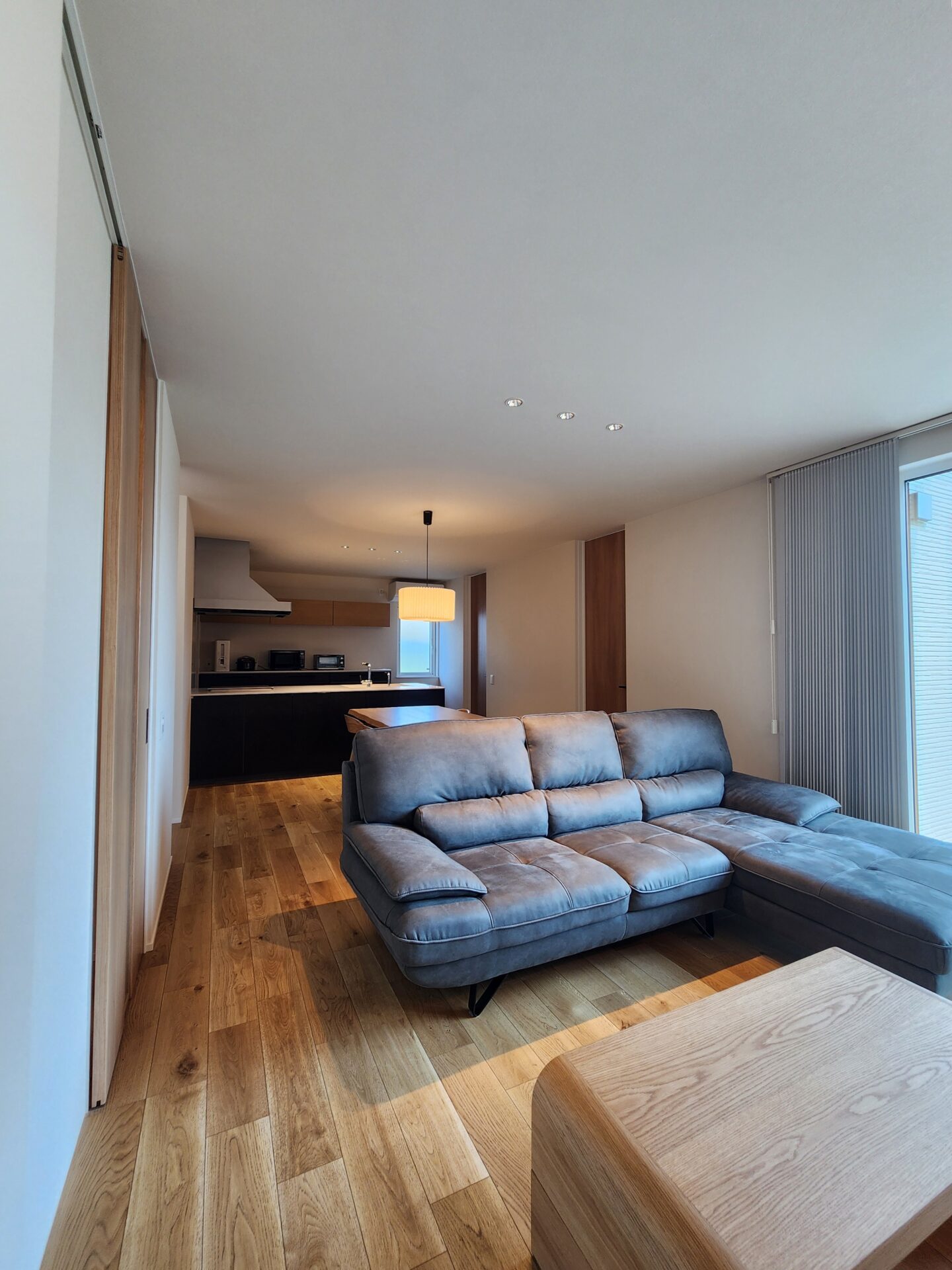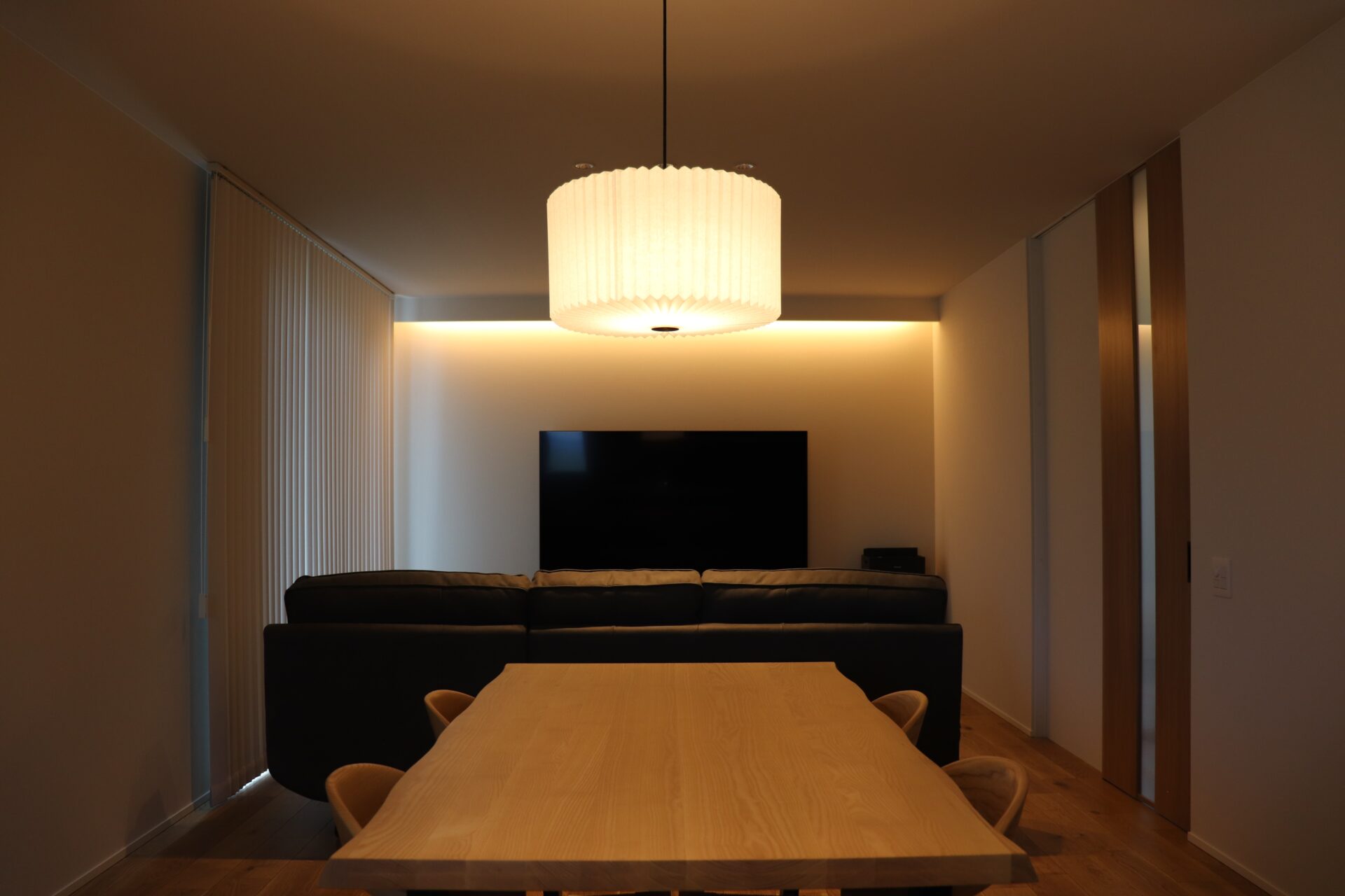 ハイドアを採用したことで視線の抜けが生まれ、実際以上の広さと開放感を感じられるリビングは、家族が自然と集まる心地よい場所に。