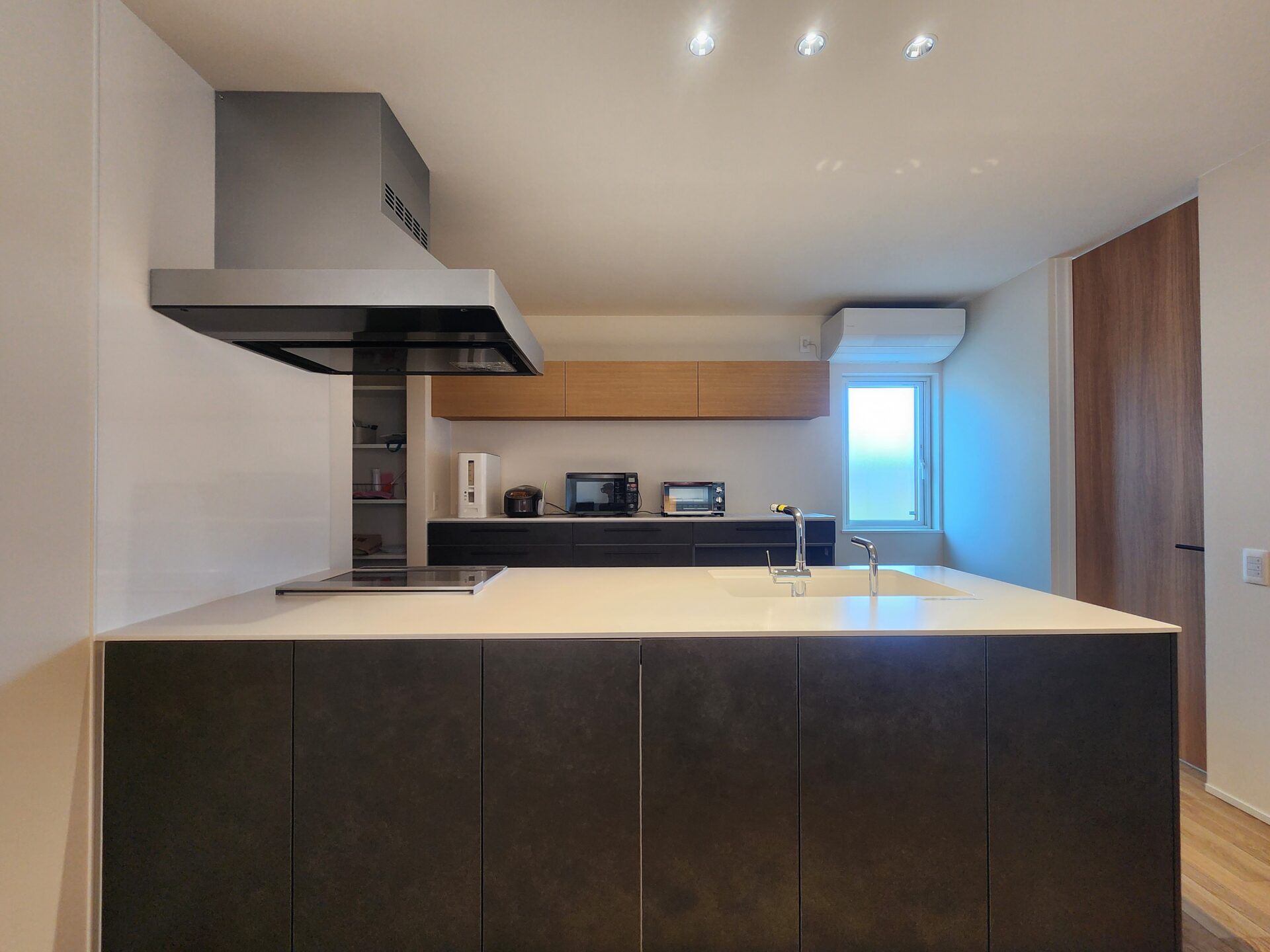 マットな黒のキッチンが醸すシックな空気感に、木目の背面収納が自然な温もりをプラス。
