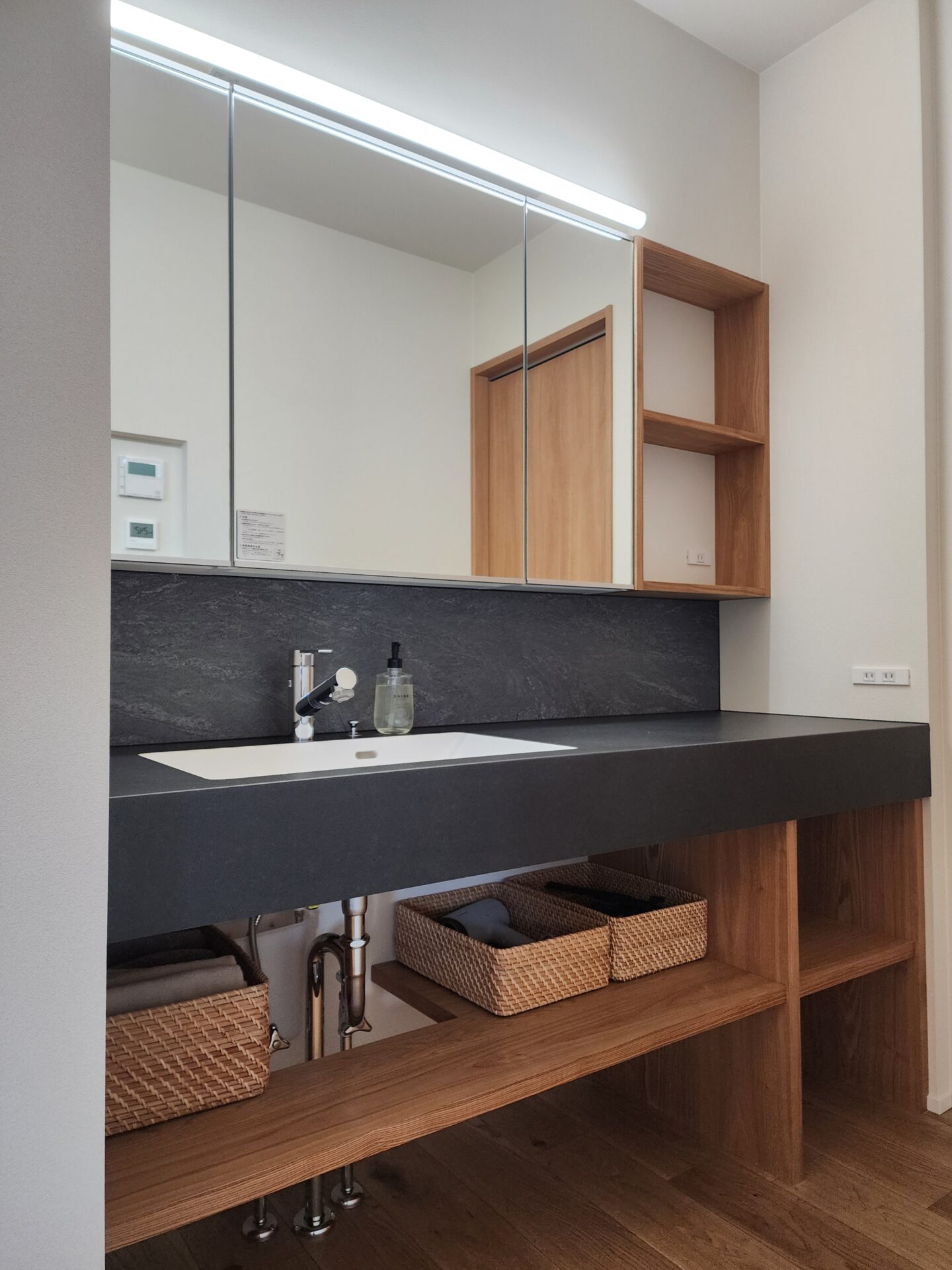 来客時にも気兼ねなく使用できる独立型の洗面室は水まわりの動線も整えられ、暮らしやすさとプライバシーの両立を実現しています。
