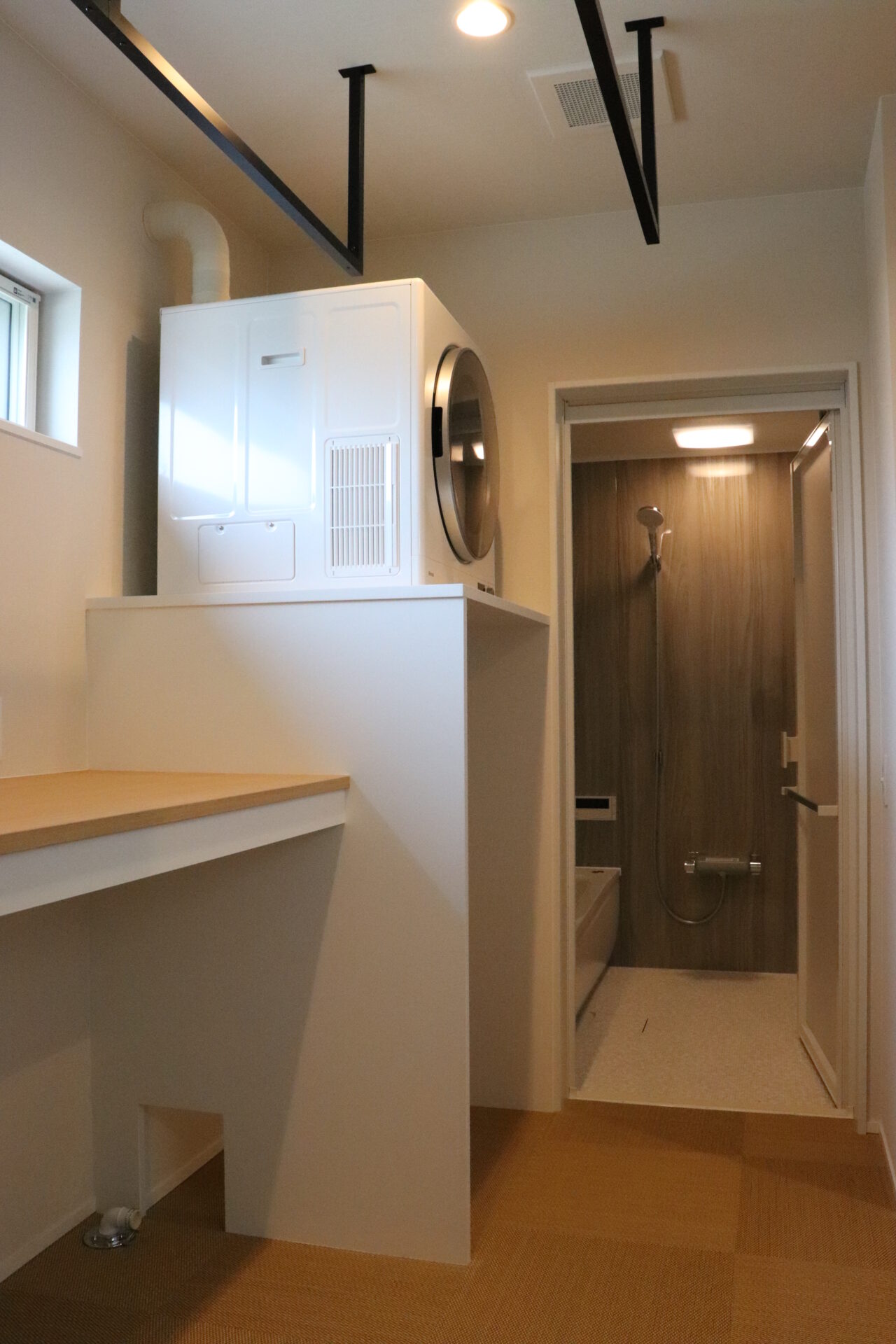 どこか温泉を思わせる、心地よい足ざわりの床材を採用した脱衣室は洗濯やアイロンがけに便利なワイドカウンターも設え、機能性と心地よさを両立した空間に。