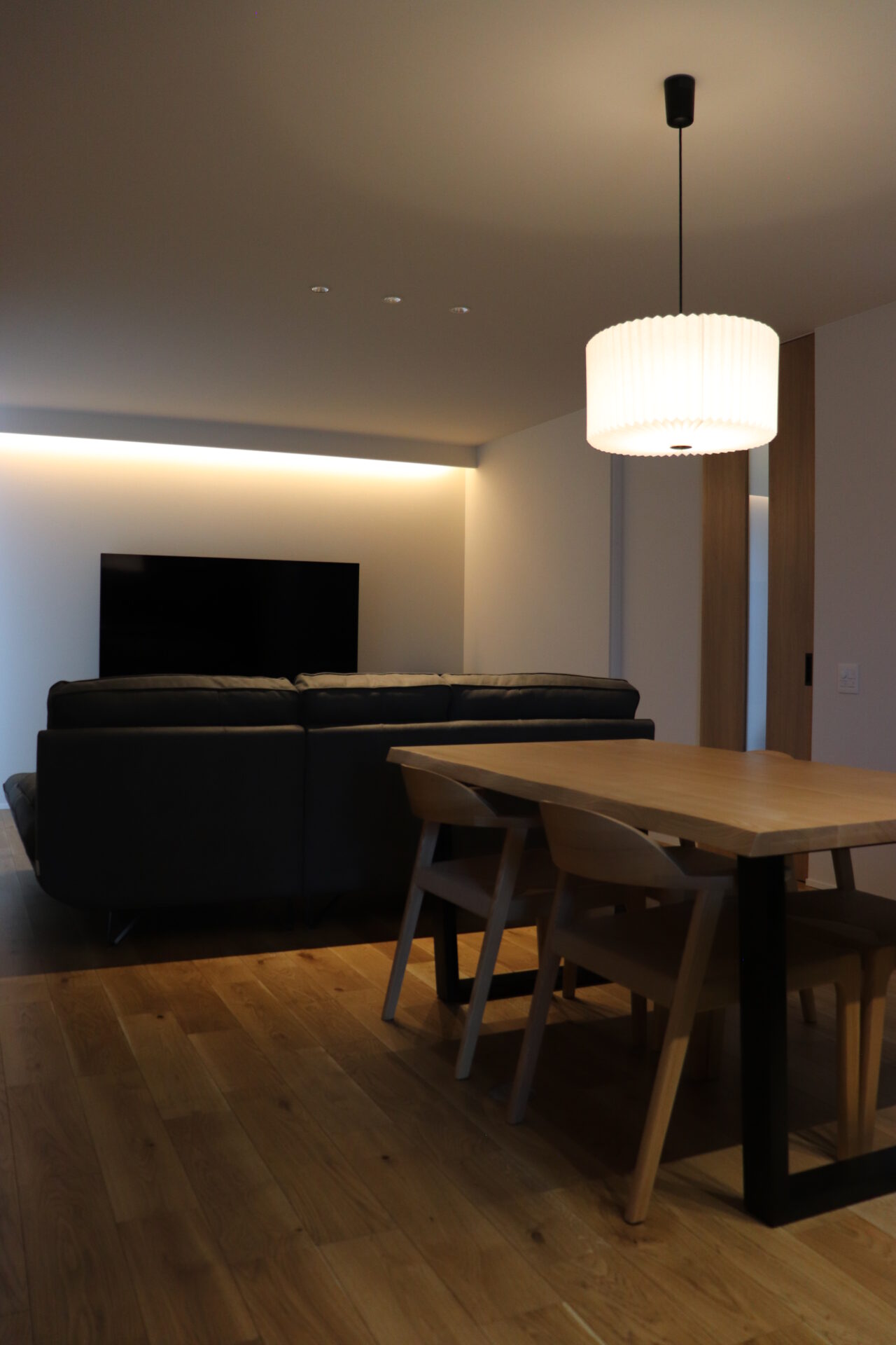 照明や窓の数を意図的に抑え、光と影が織りなす陰影の美しさを感じる空間はまるで上質な旅館のよう。
