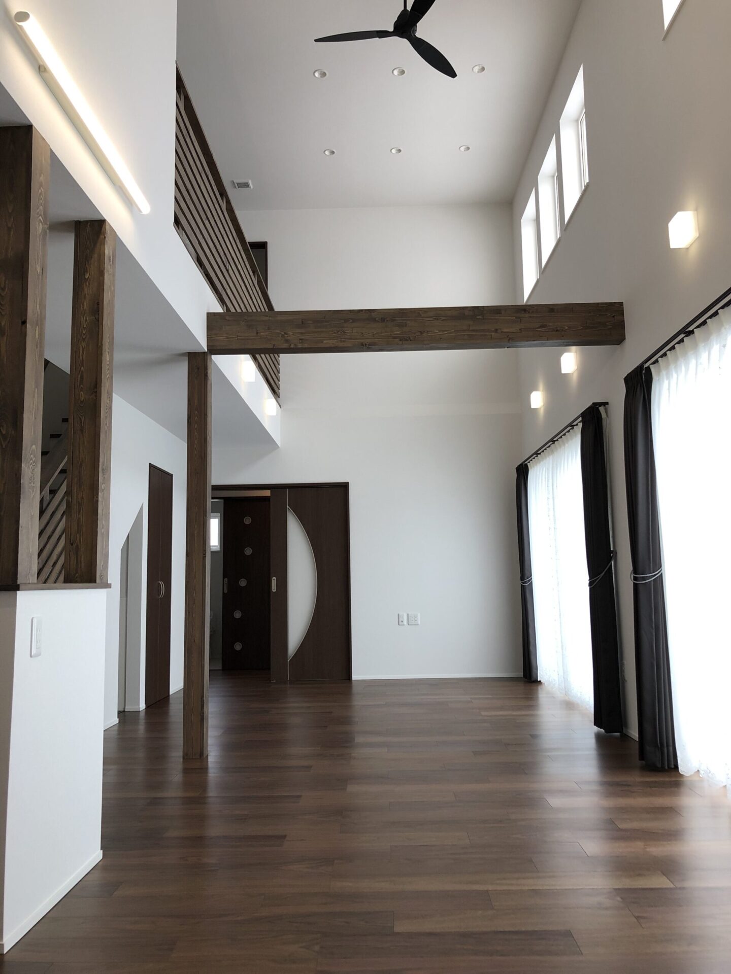 開放感溢れる吹き抜けが印象的なリビング。階段下のスペースには愛犬のお部屋を造作。